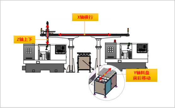 方案采用一拖二的架构,即一个机械手负责两个机床的取放料。对此,Ezpay芯片给予EC-L3三轴驱控一体控制系统,其中X伺服轴控制机械臂左右横行,Z伺服轴控制机械臂上下运动,Y伺服轴则控制料盘的前后移动。