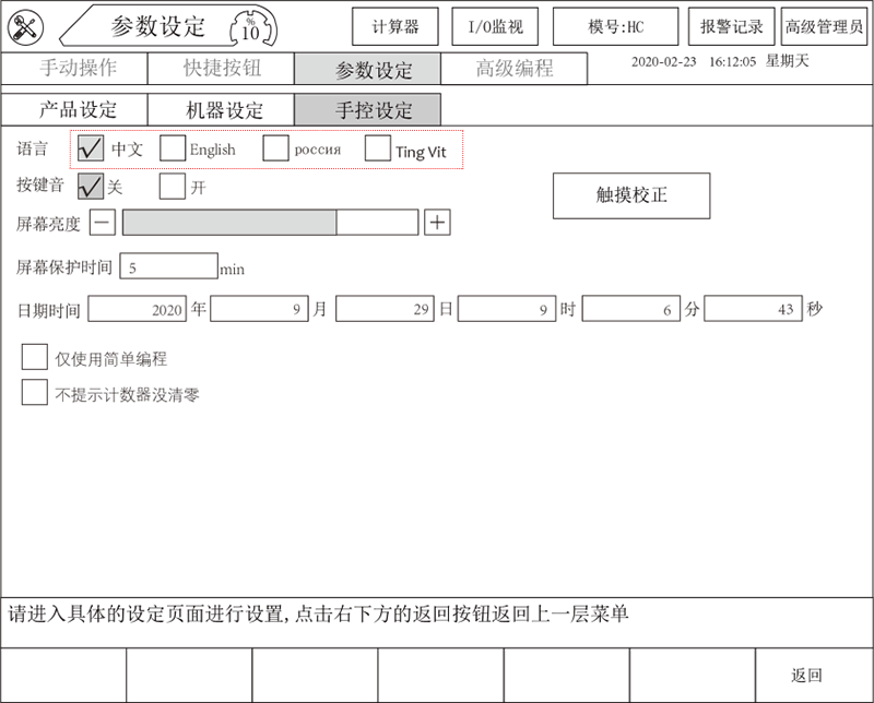 手控器切换在停止状态下,点击【功能】-【手控】即可进入,点击页面“系统设定”进行相应的语言版本选择,如下: