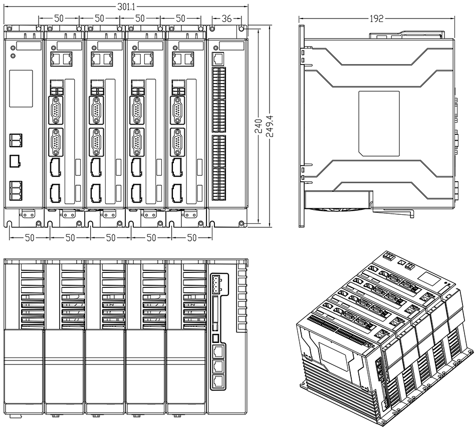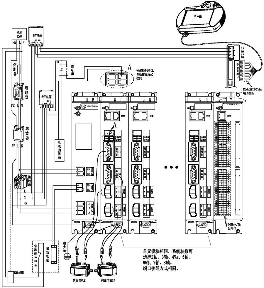 3)省略号处单元模块相同,系统轴数可选择2轴、3轴、4轴、5轴、6轴、7轴、8轴。端口连接方式相同。